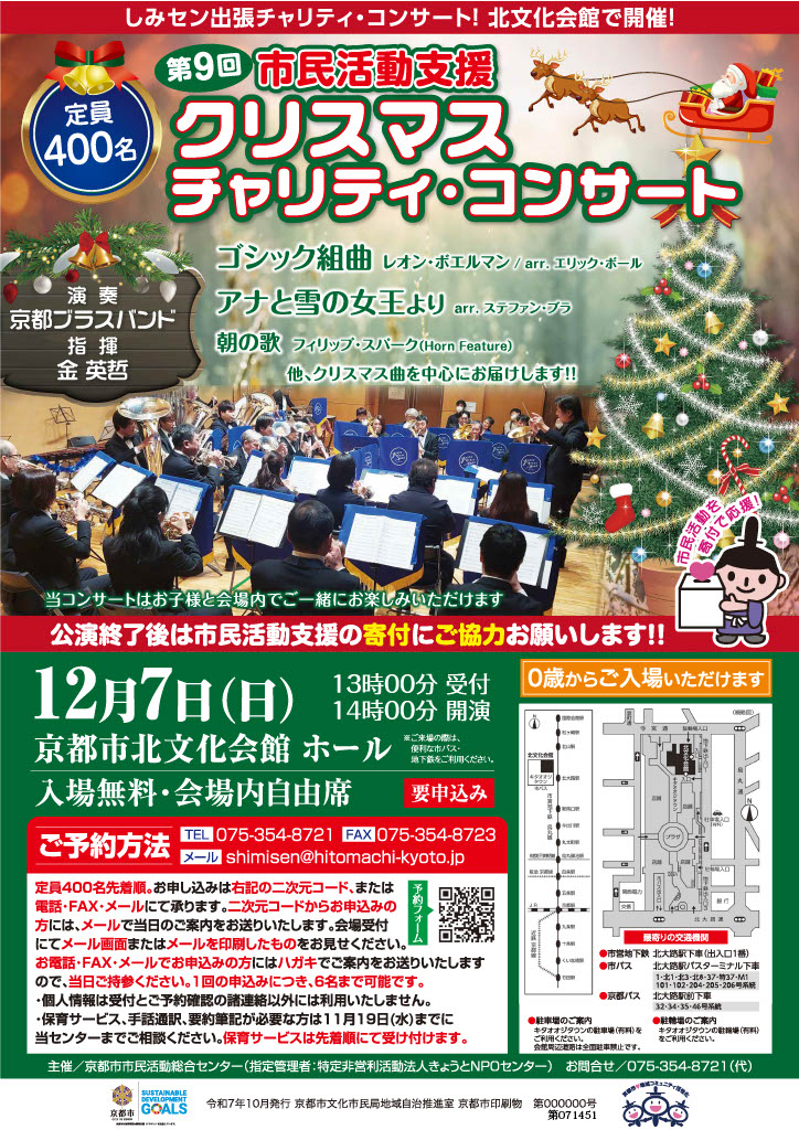 京都市市民活動総合センターがお届けする恒例のイベント、クリスマス・チャリティ・コンサートを今年も開催します!今年は北文化会館で開催です。