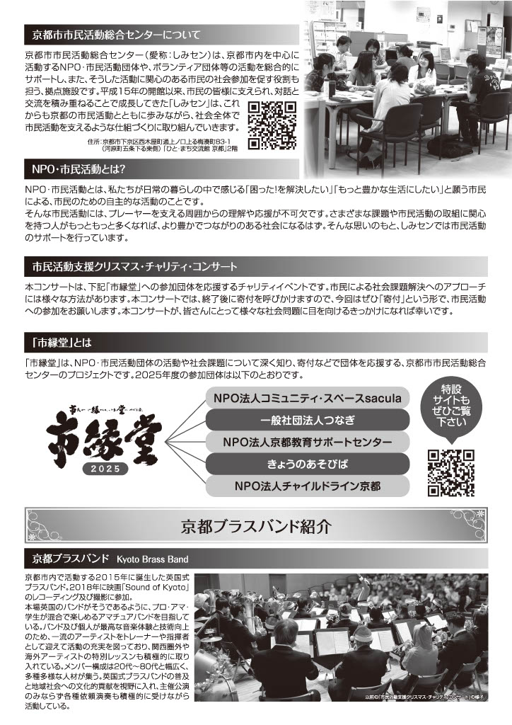 本企画は、下記「市縁堂」の参加団体を応援するチャリティコンサートです。終演後に募金を呼びかけますので、ぜひ「寄付」という形で団体の応援をお願いします。本コンサートが市民活動に目を向けるきっかけになれば幸いです。