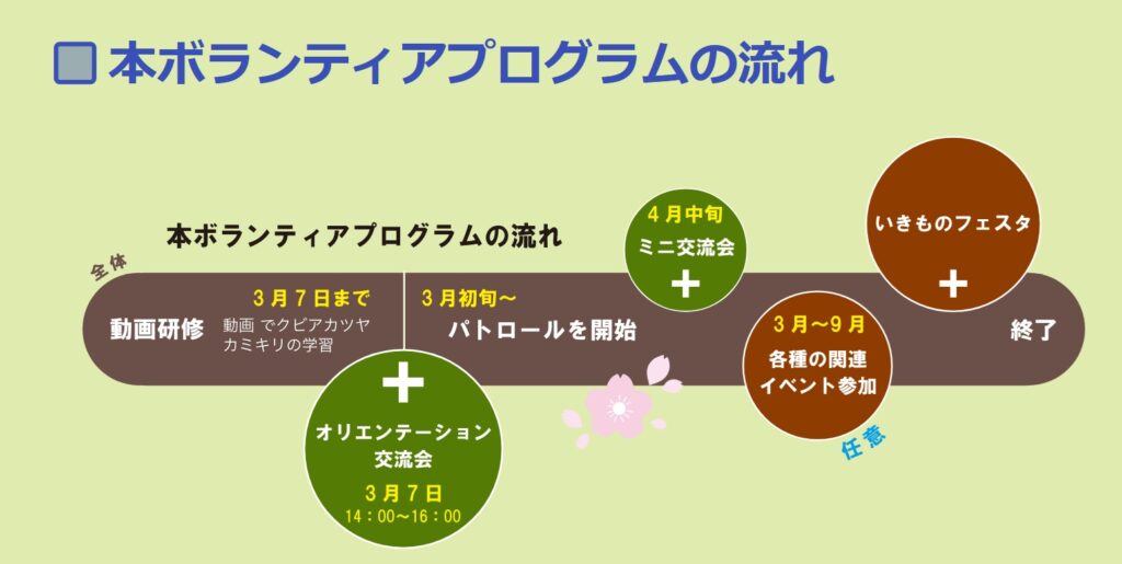 8か月間の経験を通じて、プログラム終了後も地域での環境保全活動やボランティアとして、さらに一歩踏み出すきっかけとなることを目指すプログラムです。